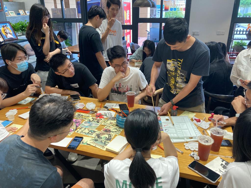 研一、研二的部分党员同志早早来到了活动地点,同时还有入党积极分子也参与了这次活动。参加活动的每个人领几张小卡片,活动要求就是在卡片上用水彩绘画出校园一角,可以是建筑、风景、人物等,完成之后会收集起来进行集中展示。大家一边绘画一边交流,主题党日活动展示不一样的特色。