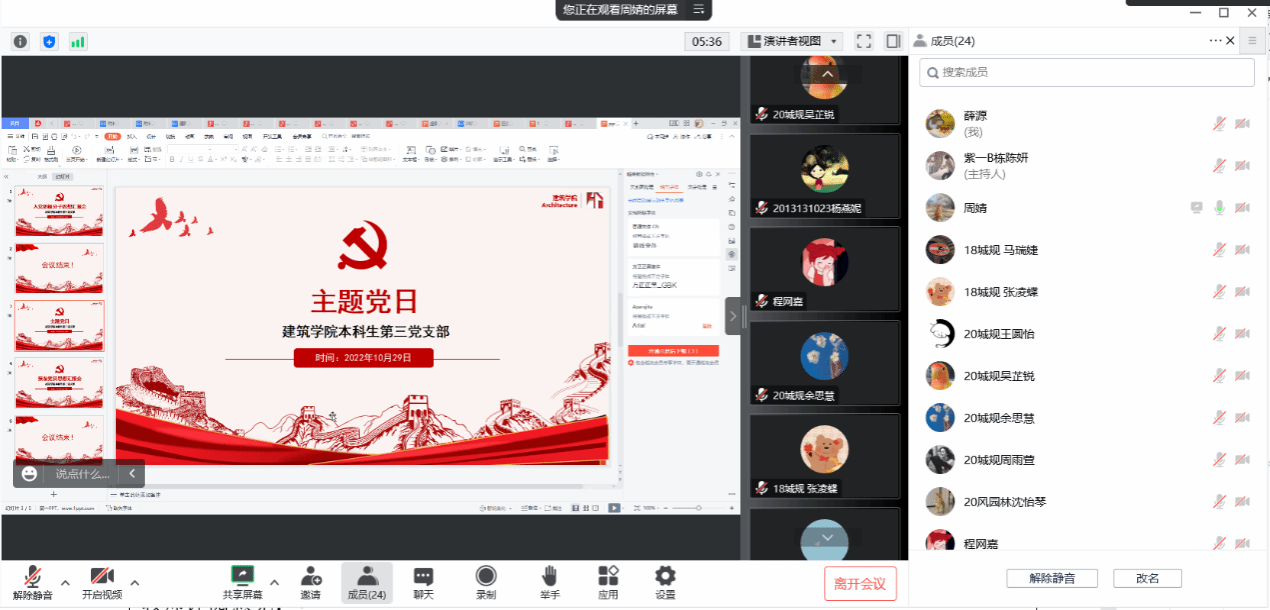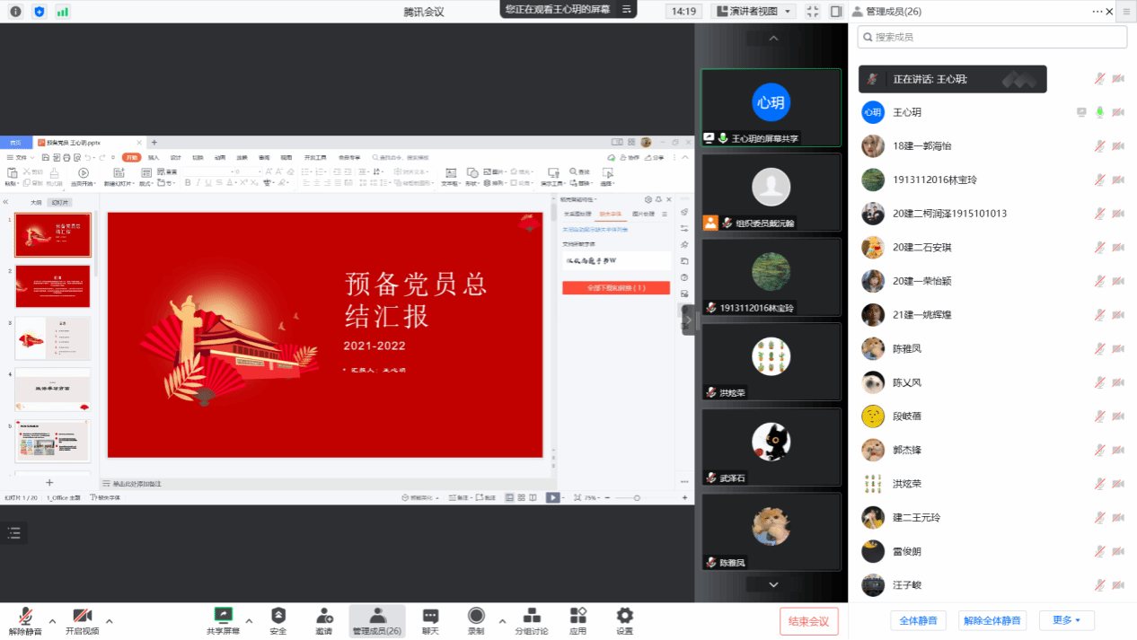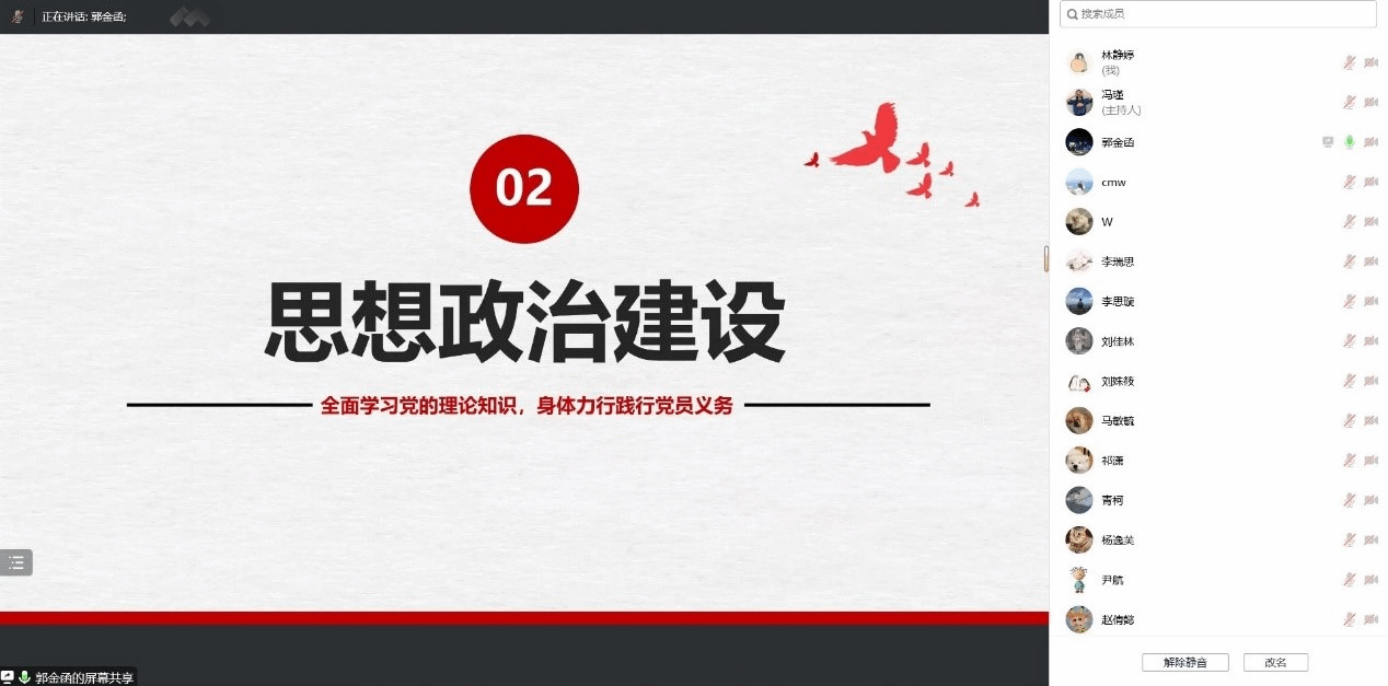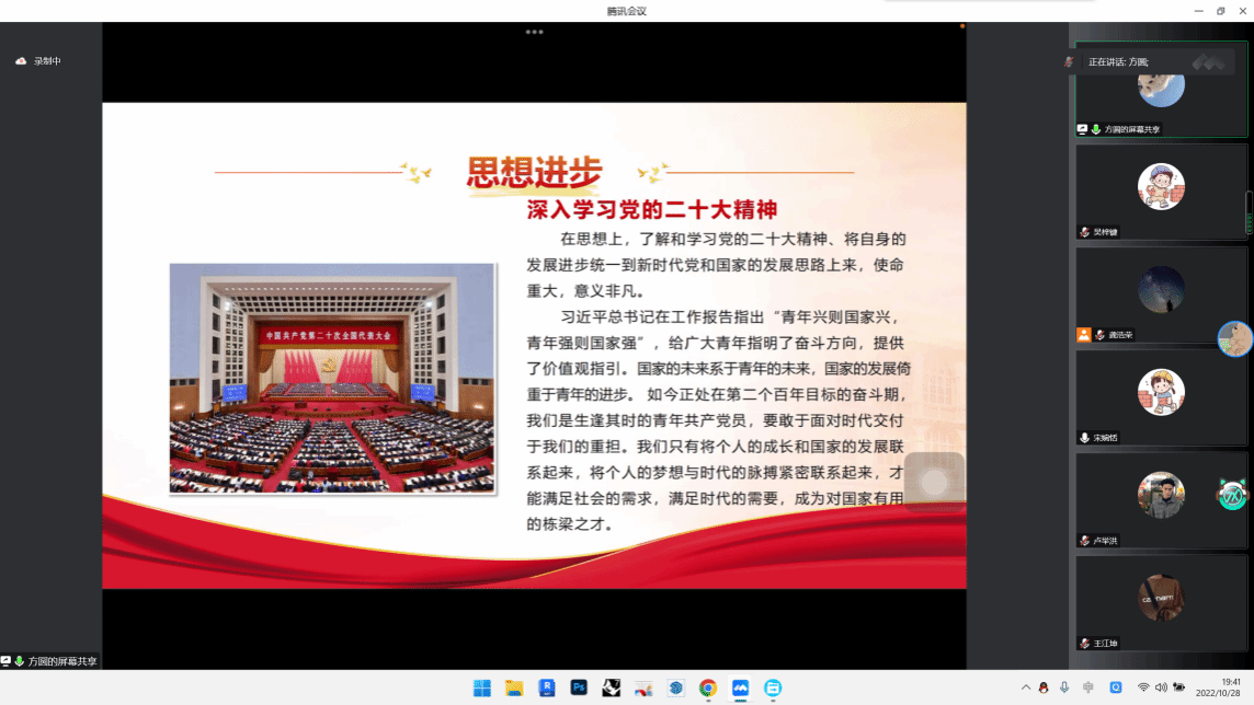 本次思想汇报会有六个学生党支部组织开展。其中,10月25日,研究生第三党支部在腾讯会议线上举办入党积极分子和预备党员思想汇报会,支部书记陈美雯主持。10月28日晚上,研究生第二党支部线上举办入党积极分子和预备党员思想汇报会,支部书记龚浩荣主持;10月29日,本科生第二党支部、本科生第三党支部分别在支部书记傅怡然、周婧的主持下召开线上入党积极分子及预备党员思想汇报会,研究生第四党支部在党建联络员徐振东的主持下,于线下教室D2-301开展入党积极分子和预备党员思想汇报会;11月1日晚上,研究生第一党支部在支部书记刘薇的主持下召开线上入党积极分子及预备党员思想汇报会。
