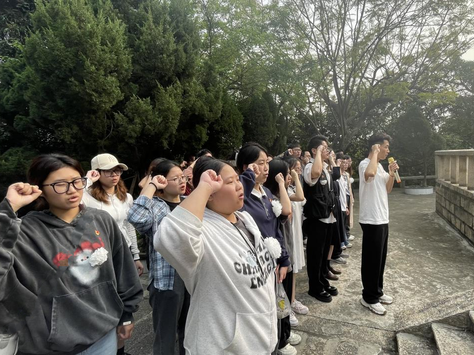 先辈回眸英笑慰,擎旗自有后来人。在研究生第三党支部书记、辅导员姜晓琪老师的带领下,全体党员面向党旗,在革命烈士纪念碑前重温入党誓词,传承红色精神。活动最后,大家绕碑一周,将胸前的白花置于碑前,以表哀思。