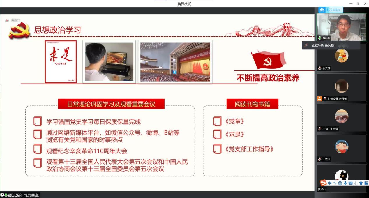 会议中首先开展了“同心助力抗击疫情”主题党日活动,刘绍庆为我们讲述了我们支部的同志们在疫情期间为疫情防控工作做出的积极贡献。支部优秀志愿者刘亚男同学向我们分享了自己在疫情期间为家乡和学校所做的疫情防控工作,并分享了自己的一些感悟。