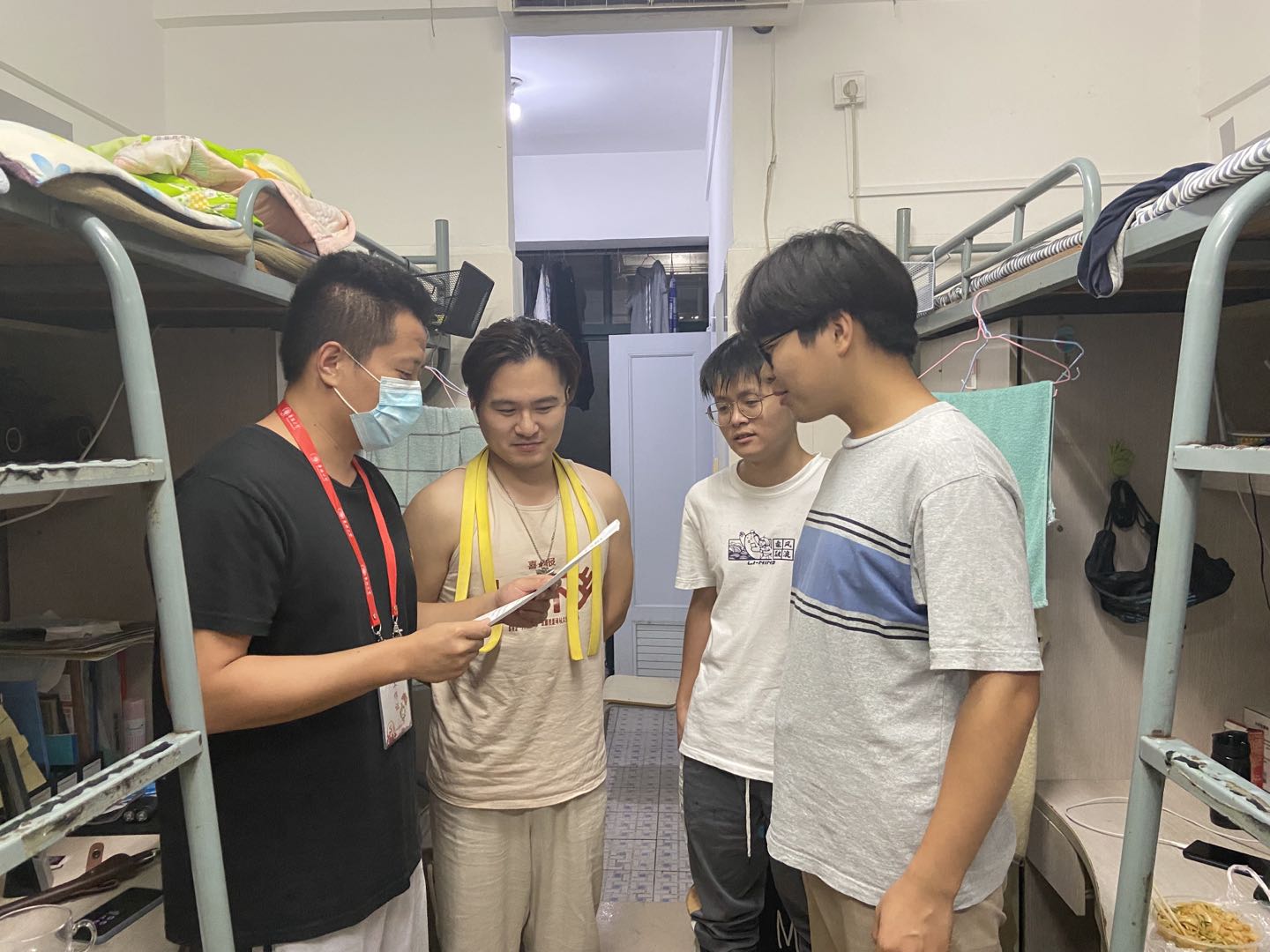 在学生宿舍,学院以党支部为依托,对学院学生入住楼栋实行网格化管理,以学生党员作为网格员对接疫情防控服务。面向“居家健康监测”的同学,学生党员、入党积极分子积极开展“非必要不外出”等防疫知识宣传,同时轮番排班,提供校内代取快递等服务举措。国庆前后,按照“网格管理、包干负责,不漏一人”原则,各党支部还深入全院355间学生宿舍,面向1000余名住宿学生开展了疫情防控健康管理“舍访”活动,叮嘱同学们牢固树立安全责任意识,认真做好个人防护,遵守疫情防控各项规定,同时倾听同学心声,为及时解决网课学习、生活等困难和问题畅通沟通渠道。