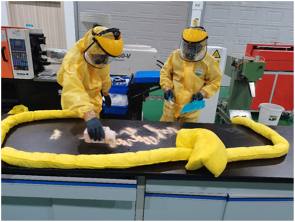 随后,在泛华科技楼材料学院中试车间进行了“危险化学品四氯化钛泄漏”的应急演练。本次演练使用少量四氯化钛加食用白醋,真刀真枪地模拟事故发生后的真实场景,具有逼真的效果。由各有关单位组成的应急救援小组和应急处置小组现场指挥,展开自救和规范处置流程。培训师屈俊勋及助理现场协助,指导防护装备和应急物资的规范使用。演练寓教于演,取得圆满效果。