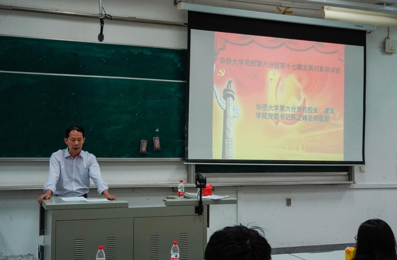 陈卫峰老师在致辞中从回顾中国共产党的风雨历程出发,阐释了中国特色社会主义道路的正确性,介绍了中国共产党发展培养青年党员的目的与重要意义,并对学员们提出了三点希望:一是系统学习党的历史和理论,增进对党的了解和认识,坚定跟党走的信念;二是自觉培养责任感和使命感,切实提升思想觉悟,做新时代青年人的榜样;三是创新学习科技文化知识,知行合一,做新时代发展的接班人。