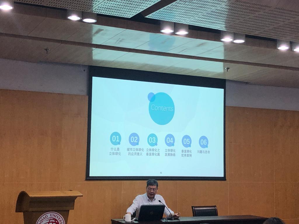 讲座开始,吴硕贤院士先给出了立体绿化的概念,指出立体绿化在生态效益、社会效益、经济效益三方面存在的优势。随后,吴院士从类型和特点两方面对立体绿化进行进一步阐释,并结合相关案例介绍垂直绿化绿化技术的分类。之后吴院士介绍了立体绿化的关键技术,从植被的选取到绿墙的生长介质再到滴灌系统,每一步都是做好立体绿化的前提。为了让师生们更好地了解我国立体绿化的发展现状,吴院士选取了上海、广州、深圳三座城市,根据其立体绿化现在面临的问题以及其发展前景做了简要的概括。吴院士指出我国立体绿化的发展同国外相比还较为落后,与立体绿化相关的法律法规还不够完善,设计规划人员对立体绿化的意识也还不够。吴院士希望师生们能关注立体绿化这个新方向,并且提出了对于立体绿化发展优化方向的建议,指出可以将立体绿化与声景、光景相结合,打造丰富多彩的景色。最后,吴院士分享了优秀案例,希望我们从案例中获得启示,开阔思维,指出我们不仅可以从立体绿化的材料、结构方面推陈出新,还可以从外形上进行创新。