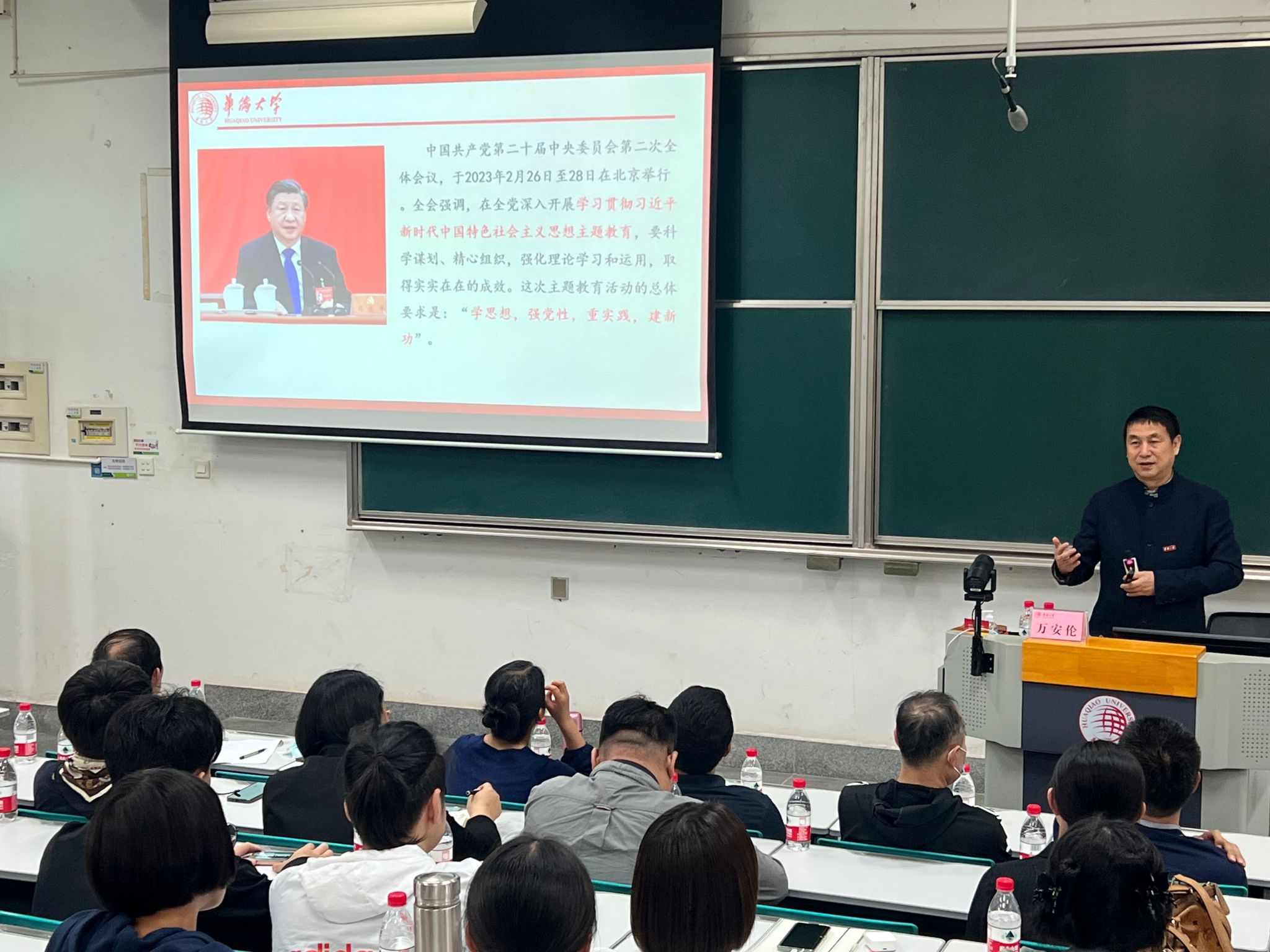 报告中,万安伦通过举实例,以党的二十届二中全会的主要内容为出发点,全面解释了“学思想、强党性、重实践、建新功”四个词语,阐述了思想力量的强大以及对现代化的理解,着重强调理论的作用在于指导实践。他并向师生介绍了中国式现代化的历史演变及本质特点。