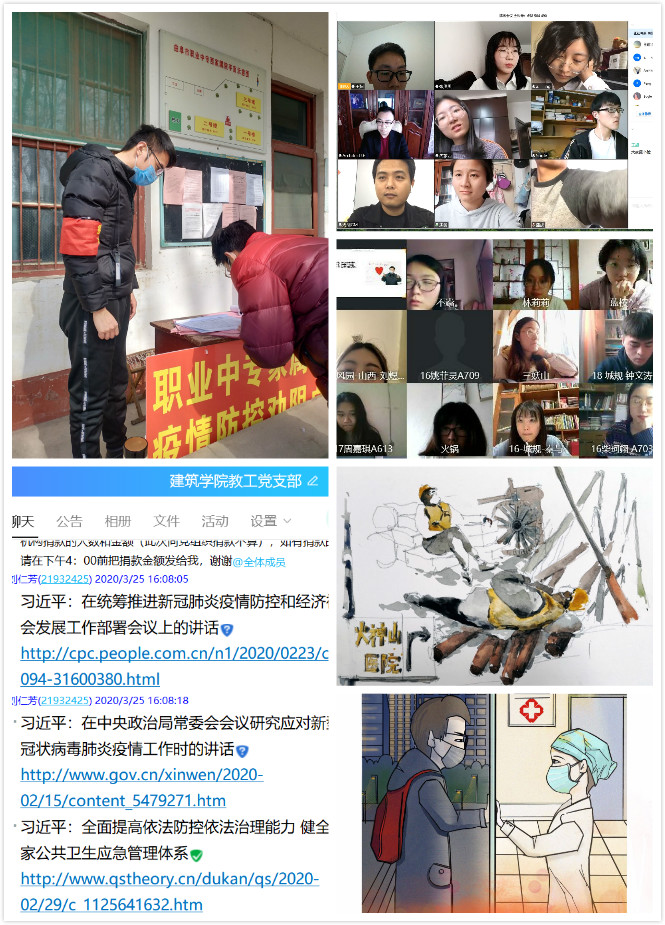 在召开组织生活会前,各党支部提前将学习资料发给党员自学,并鼓励党员根据自身实际情况积极参加当地疫情防控工作。教工党员王黎同志、2019级博士生党员周志强同志等10多位党员、入党积极分子参加了当地社区的疫情防控工作,做好了社区出入人员登记、密集人员流动区域消杀、居民生活物资代购等服务;学院党员响应上级党组织号召,积极自愿捐款支持新冠肺炎防控工作,不少家庭困难党员也第一时间向党支部捐款,学院共计捐款11989.9元,捐款率达97%。在积极参加组织生活的同时,涂小锵、李慧东等党员发挥专业所长,用画笔记录下了那些坚守岗位、日夜奋斗的医护工作者们以及许许多多挺身而出的普通人,用特殊的方式向奋战在一线的英雄致敬,凝聚战“疫”必胜的信心。