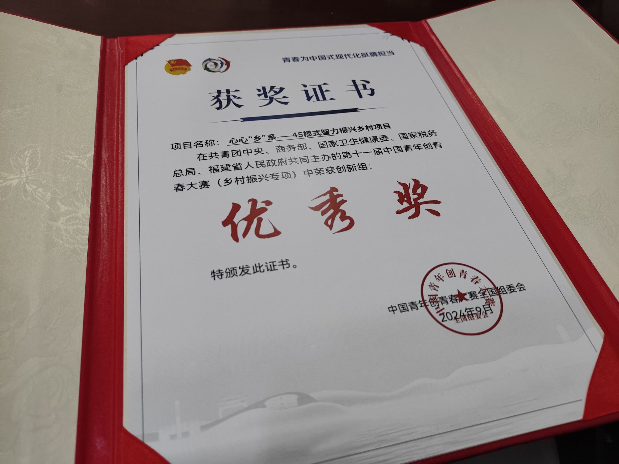 近日,由共青团中央、商务部、国家卫生健康委、国家税务总局和福建省人民政府共同举办的第十一届中国青年创青春大赛(乡村振兴专项)在福建省漳州市举行。我院“心心‘乡’系——4S模式智力振兴乡村”项目获得优秀奖,这也是我院在该项赛事中首次获得国家级奖项。