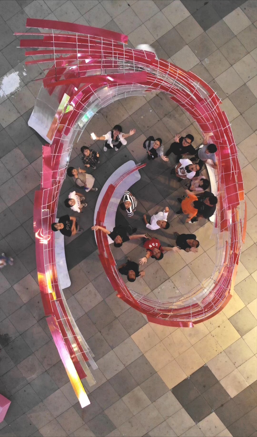 据悉,“国庆70献礼”大型建构作品为yl23411永利集团2019数位建构工坊的成果展示,作品创作灵感来源于“70”周年,“A”rchitecture(建筑),飞鸟等元素,选用廉价的建筑钢筋和彩色阳光板为材料,运用先进的Ar和机器人空间定位技术,将参数化工具模拟粒子运动形成轨迹,由学生自己手工制作而成。创作过程更是对现实与虚拟,人脑与电脑,传统手工艺与现代数控加工等对立统一关系的一次有益探索