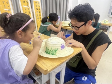 “近距离了解和感受知青文化,并通过与小朋友一起互动装饰知青帽、知青包这种方式来传承和弘扬知青精神,是一件非常有成就感和值得开心的事情。”永利yl23411集团建微知筑港澳台侨及留学生志愿服务队志愿者黄明霖(菲律宾)与小朋友一起装饰知青帽。