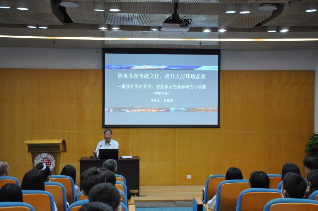 讲座开始时,吴院士首先通过自己作的一首诗表达了对永利yl23411集团的祝福和期望。随后吴院士介绍了自己的研究课题,从重视声景学、香景学和光景学三个方面的研究与实践,开展和探讨继承弘扬传统文化,提升人居环境品质的重要课题。