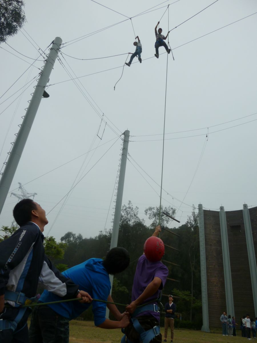 经过中午一番简单的休息与整顿之后,天气也慢慢晴朗起来。大家也都蓄势待发,因为下午将迎来的第一个项目,就是极具挑战性的“高空走钢丝”。队员们在安全的保护措施下,爬上14米的高空,依靠自己的勇气及对队友的信任,在上面走一段钢丝。然后从14米高空倒下,由下面的确保团队,将其缓缓降落至地面。整个项目进行中,首先是锻炼每个队员自身的心理素质,通过“暂时失去安全感”,挑战内心的害怕与恐惧,让自己的心理得到更加健全的拓展与考验。其次,项目能够顺利完成,也极需下面确保团队的配合与协作。他们的确保工作做得好坏,也直接影响着上面同学的挑战能否顺利完成。整个挑战过程中,耳边经常响起“加油”“很好”“你很棒”“你可以的”等为挑战者加油打气的声音。令人可喜的是,经过一个多小时的配合与磨练,团队所有队员都一一安全地经历了一次挑战自我的尝试。大家都为自己的勇敢与突破感到十分欣喜。