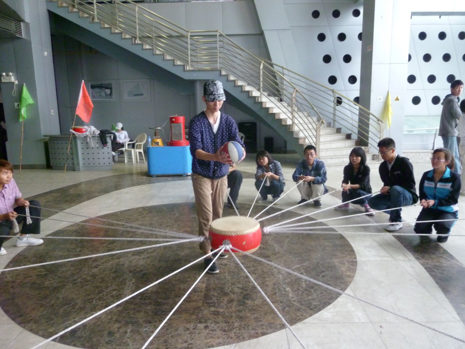 在接下来的活动中,大家以团队比赛的形式,开展了“支点最少”、“游皮划艇”、“以鼓垫球”等活动,所有活动紧紧围绕着团队合作与配合展开,旨在让大家通过游戏与活动学会团队之间的相互协作与宽容。虽然中途一度下起了大雨,但同学们依然热情不减,积极地投入在整个活动的氛围当中。