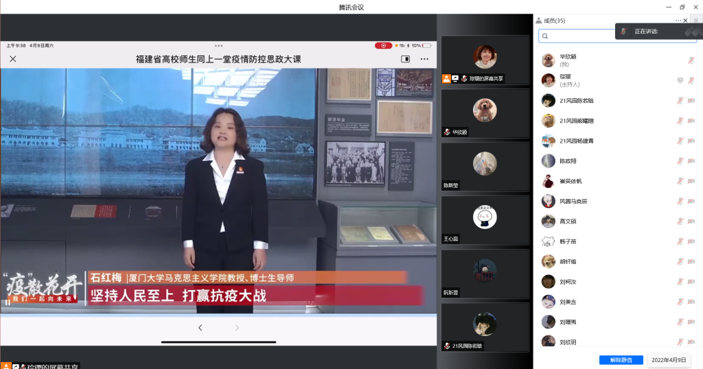 4月9日,福建省疫情防控思政大课在线上开课,通过组织线上集中收看和自行收看的方式,我院860余名师生同时在线观看,同上一堂课。
