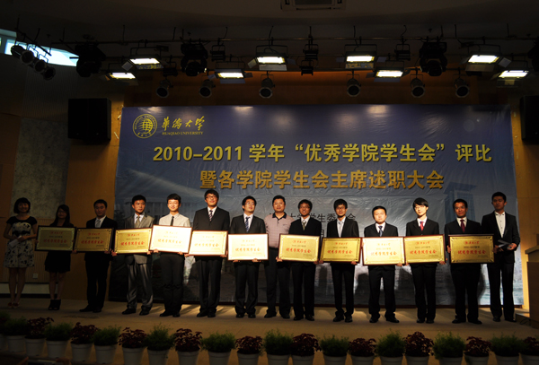我院学生会获校“优秀学院学生会”荣誉 作者:陈岳东 近日,2010—2011学年“优秀学院学生会”评比暨各学院学生会主席述职大会在泉州校区明德堂举办。本次活动由校学生会主办,学生处处长陈国柱各及学院学生会代表出席了本次大会。 “优秀学院学生会”的评选方式包括评选材料和现场展示两个环节。校学生会根据学院学生会提交的申报材料进行评分,并于5月21日公布成绩。现场展示由各学院学生会主席代表学院学生会进行2010-2011学年工作述职演说,并由学院推荐的42名学生代表进行现场评分。 我院学生会主席吴鑫鹏作为压轴出场,一上台就以幽默诙谐的语言赢得全场的掌声。随后他阐述了我院学生会的建设制度,总结了一年来我院学生会所举办的活动以及取得的成果,并详细介绍了我院的特色活动——“光明之城”建筑文化节。通过宣传片的放映和PPT的展示,让在座评委深切感受到我院学生会一年来所取得的优良成果。 最终,我院以总分87.6分的好成绩成功荣获2010-2011校“优秀学生会”光荣称号。
