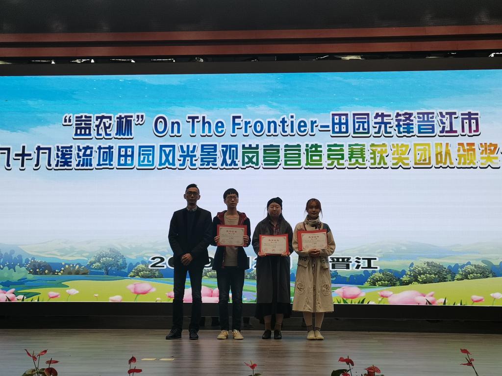 大会分为两个阶段,第一阶段由亚太青年创意休闲产业智库、亚太创新知识学院执行长、广州暨南大学兼职教授、台湾休闲游憩学会副秘书长郑敏庆博士对本次活动进行点评。他强调了设计的想法源于生活,设计的思维应顺应时代潮流。第二阶段为大会的颁奖仪式,晋江市副市长张汉杰、晋江市农业农村局局长李友加、永利yl23411集团(晋江)乡村振兴研究生工作站主任吴少峰为“益农杯”On The Frontier-田园先锋晋江市九十九溪流域田园风光景观岗亭营造竞赛一、二、三等奖和优秀奖作品的参赛团队颁奖,并与同学们现场合影。至此,颁奖典礼圆满落幕。