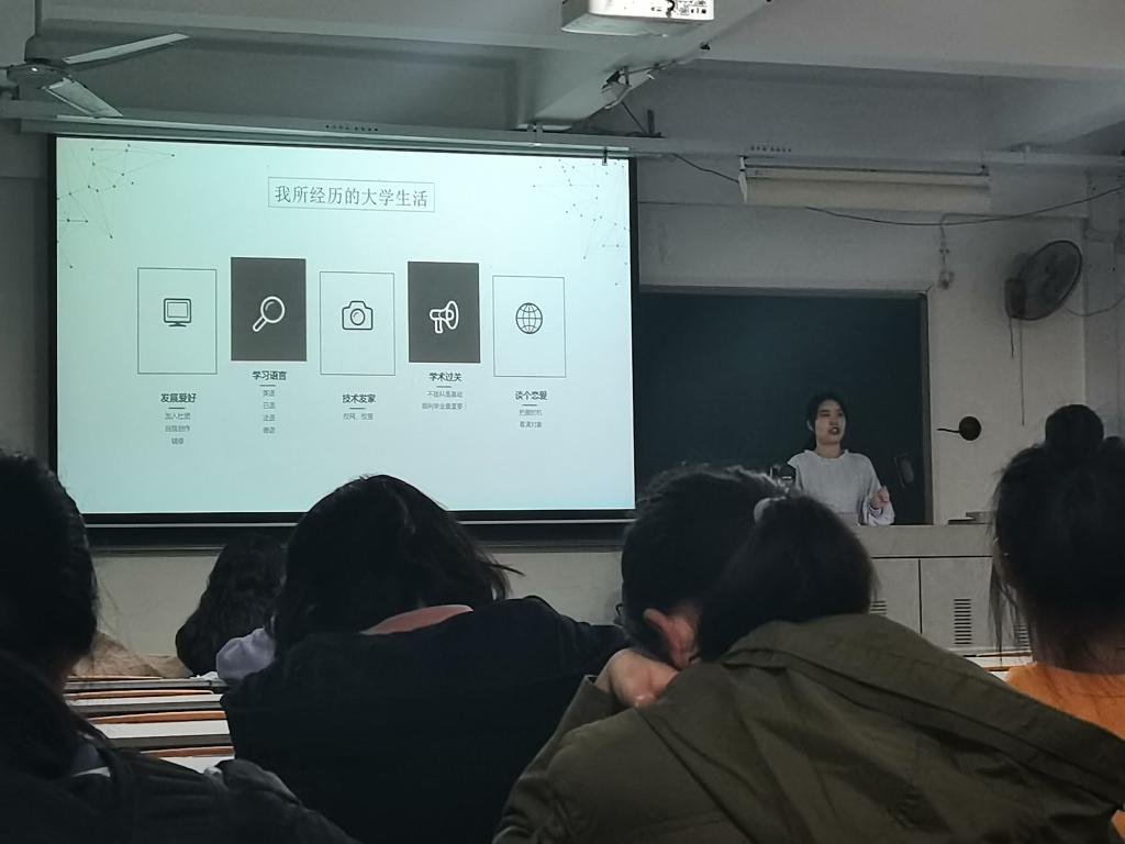 紧接着,来自城市规划学的研究生阎春学姐把自身从大一到大五的经历分为三个阶段,向同学们讲述了大学生活应该如何有意义地度过,基于自身的经历,给学弟学妹们的大学生活提出了自己的意见,让他们对今后五年的大学生活有了基本的认知。