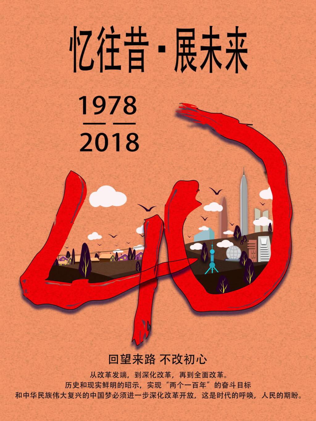 在谈到设计思路时,黄伟凯介绍道,“《忆住昔,展未来》海报设计以庆祝改革开放40周年为设计出发点,海报主体为阿拉伯数字‘40’,数字‘4’里镶嵌的插画为改革开放前的农村插画,数字‘0’里则镶嵌了改革开放后由著名地标组成的城市景象,运用了今昔对比的设计思路”。“改革开放以来农村到城市取得了巨大成就,这样以城市带动农村的发展,向着两个一百年目标前进,中国梦就将完满实现。”