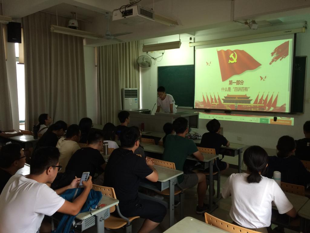 10月13日下午,华侨大学yl23411永利集团研究生第一党支部在教学群楼举行了一场“两学一做·书记讲党课”活动。党支部书记王超以“喜迎党的十九大,争做四讲四有合格党员”为主题为研究生第一党支部的二十多名党员和入党积极分子讲了专题党课。
