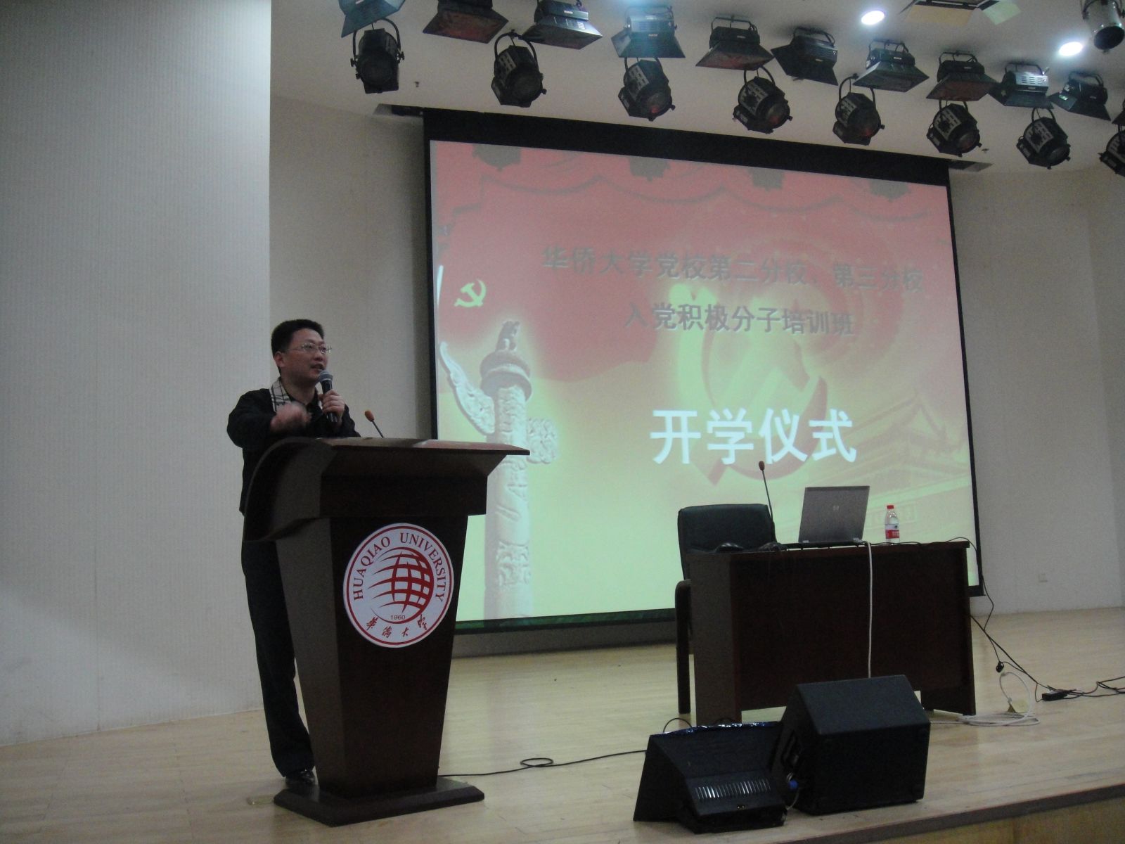 会场秩序井然,全场气氛庄重。在全场师生激昂的《国际歌》演唱之后,高炳亮老师致辞。高老师从“当代大学生为什么要入党”开始演说,强调纪律对于每一个党员甚至大学生的重要性;他认为积极分子应该多学习党的理论知识,不断端正入党动机,同时希望在座的学员能够在有限的课堂上学有所得,学有所思,并顺利通过党校的结业考核。