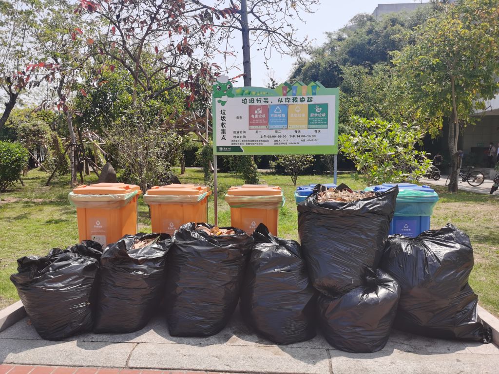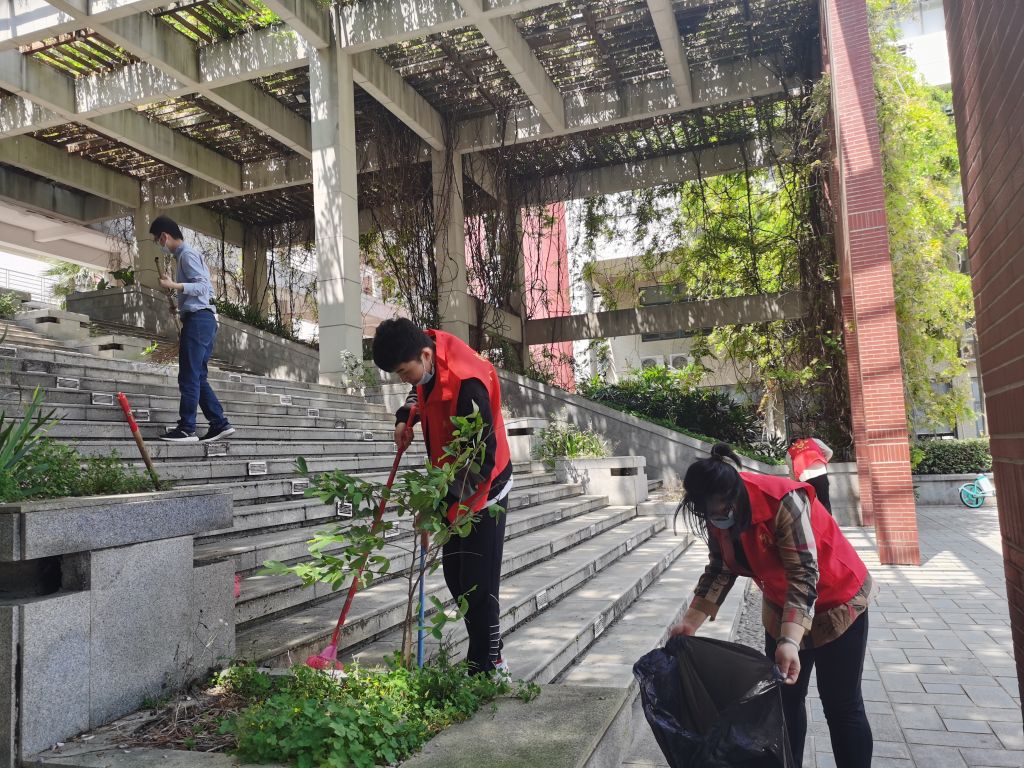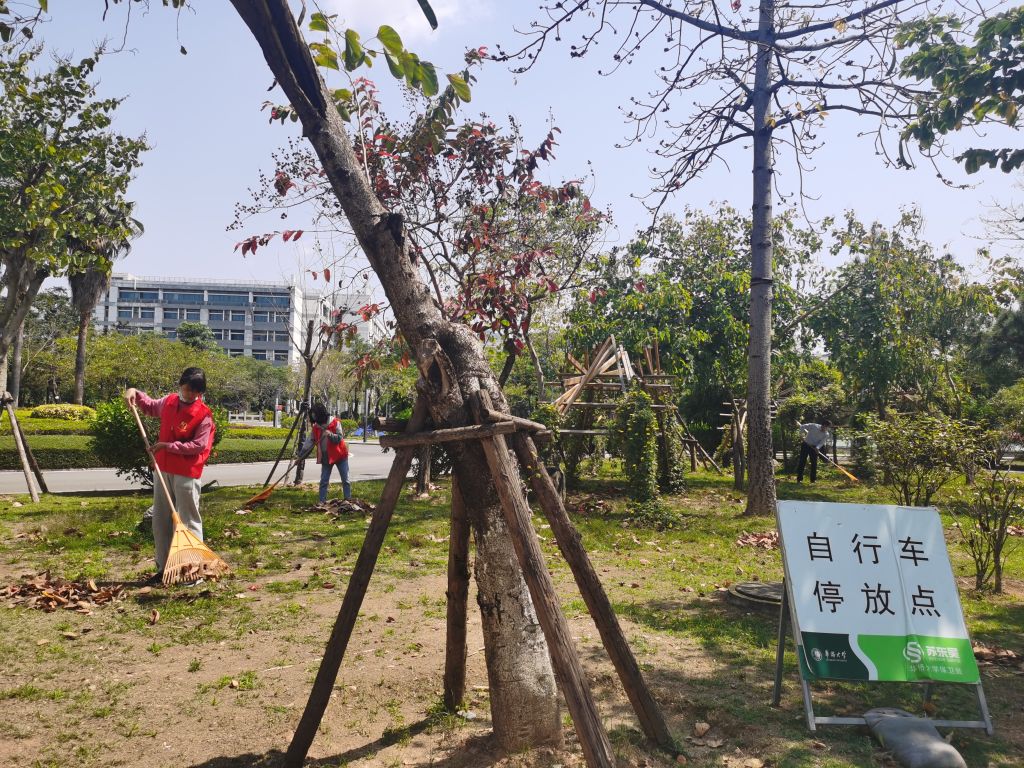 在物业人员的指导下,志愿者们分工合作,互相配合,进行卫生劳动。他们身着红色志愿服,或手持卫生工具,对台阶、草地等处落叶进行清扫;或手持修剪工具,打理圆球盆景;或手提畚斗,将垃圾成袋整理打包,使校园一角焕然一新。