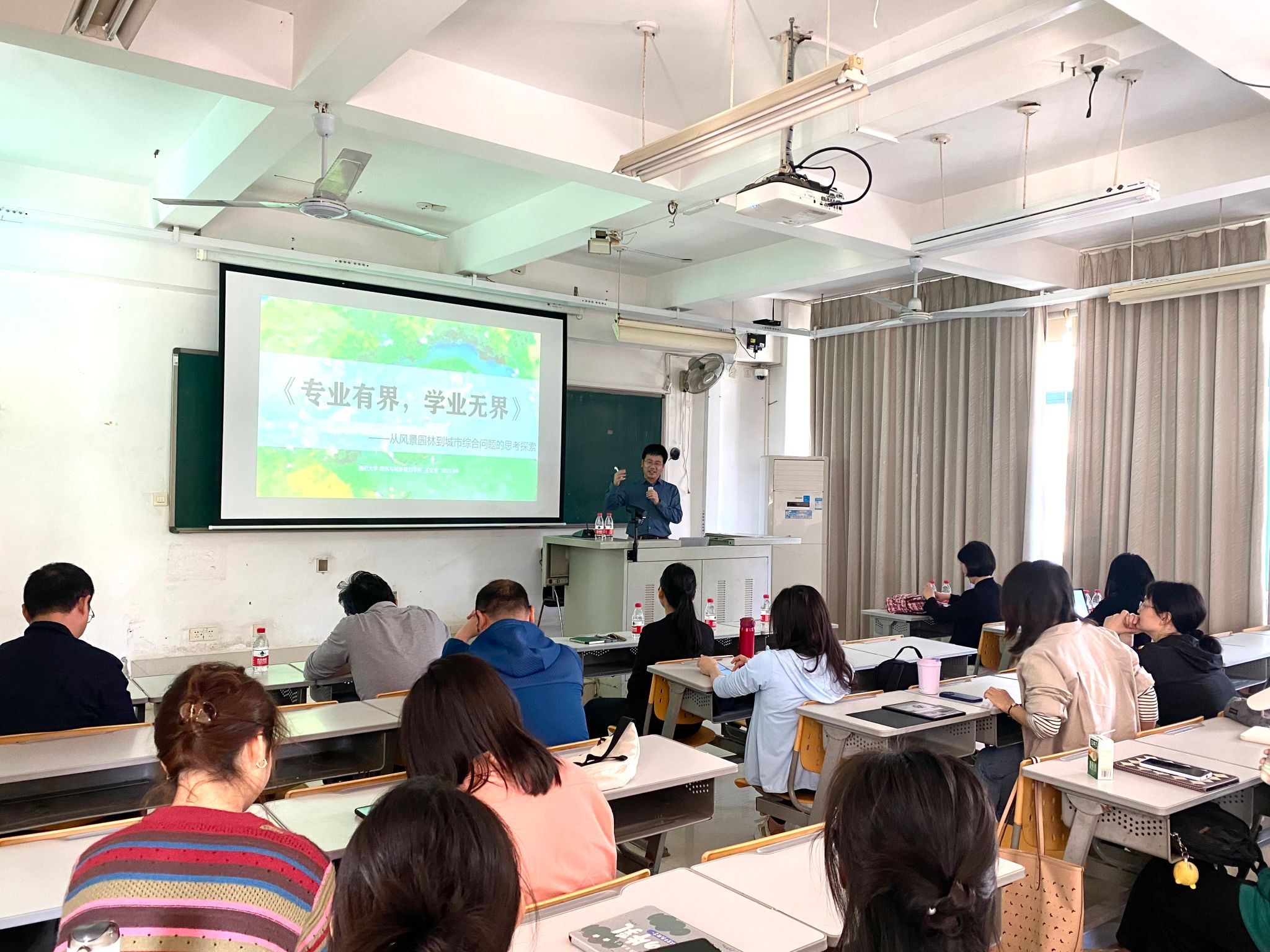 会上,王文奎循循善诱,结合自身经历、时事热点、专业热议话题引发思考,引入讲座主题——专业有界,学业无界。以福州晋安公园等福州近几年城市风景园林及生态环境建设的范例和成就为例,抽丝剥茧,鞭辟入里,向老师和同学们讲述设计背后的故事,讲述风景园林专业应有的更开阔的视野,由“园”到“城”;由城市山水格局到造园堆山理水;从规划到设计,是理性的、逻辑的层层深入。王文奎通过案例的阐述展示了多学科融合发展的重要性和方法途径,展示了当今风景园林及相关专业学科面临的新挑战,同时,也启迪我们面对未来复杂的城乡发展问题,应该突破风景园林的专业界限,以多专业协同、多学科融合的视角进行探索与实践,专业有界、学业无界、事业无界。