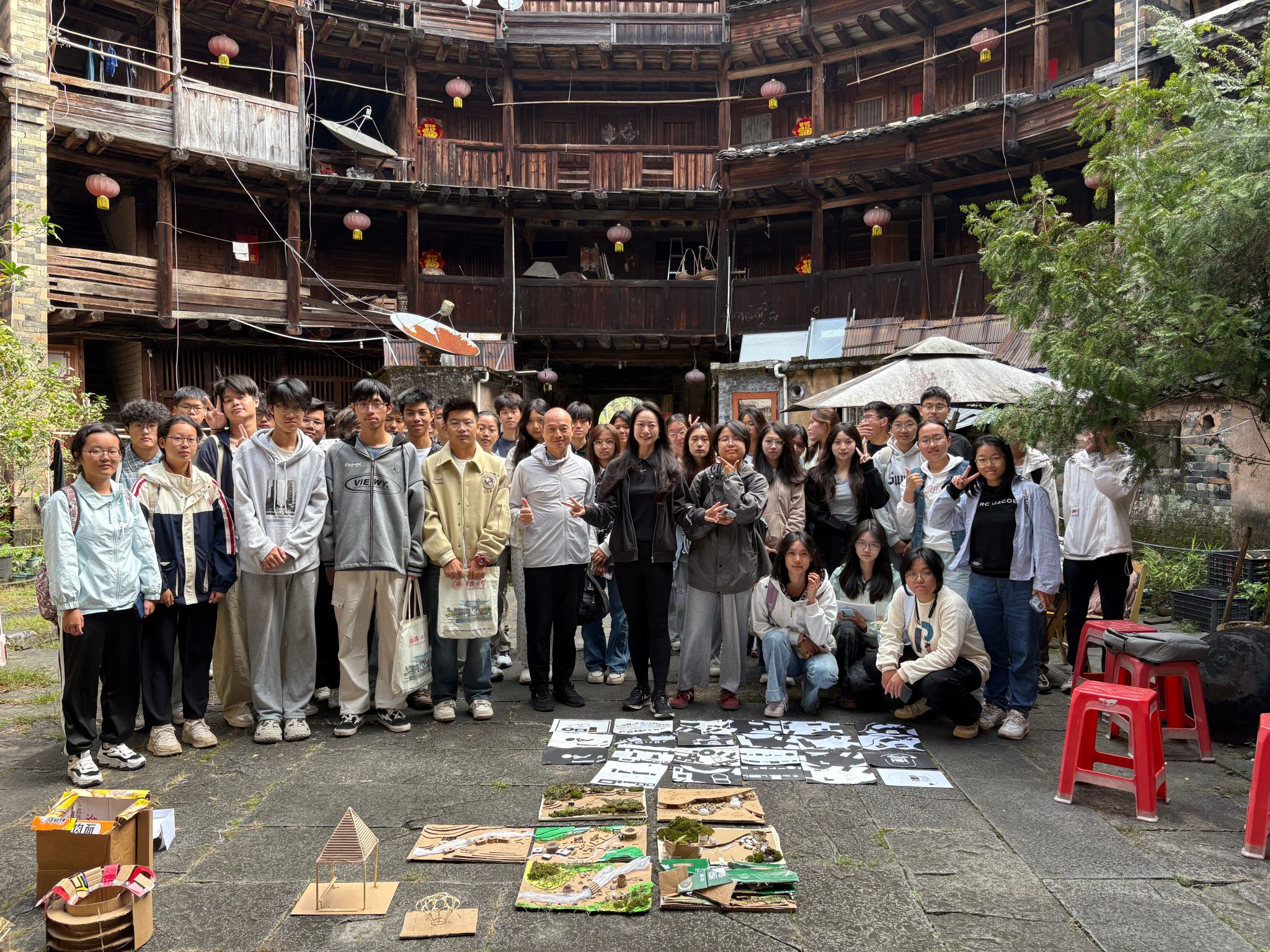 在认知实习阶段,老师们以“你会选哪里建宅基地?”这一生动的问题为切入点,引导学生们将书本上的抽象概念与真实的土楼环境联结起来。在老师们的悉心带领下,学生们行走于塔下大坝村之上,借助地形图精准确定方位,感受自然地形与建筑布局的微妙关系。随后,大家分组制作村落肌理拼贴和山水关系模型,在亲手操作的过程中,对空间结构有了更为直观的认识。期间,系列专题讲座的开展,进一步深化了学生们对客家文化与自然聚落关系的理解,为专业知识储备添砖加瓦。