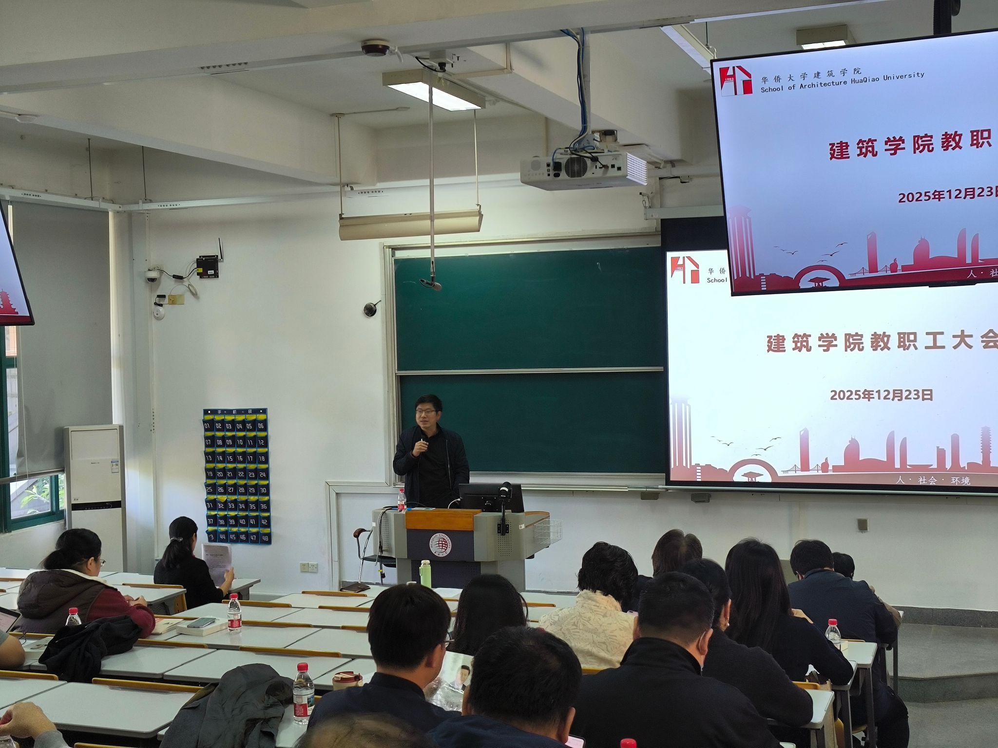 院长陈志宏通报了学院近期在多个领域取得的成果:国家自然科学基金、国家社会科学基金等课题申报均获批立项;国家级一流本科课程建设取得新突破;教师团队在教学创新大赛中表现优异;学生团队在“挑战杯”专项赛中荣获全国三等奖等。他还特别分享了近期参加天津大学纪念童鹤龄先生诞辰百年活动的感受。他结合童鹤龄先生当年对筹办永利yl23411集团建筑系所提出的宝贵意见,深情回顾了学院的办学初心与发展历程,强调要继承和发扬老一辈教育家的崇高精神与严谨学风,将“为侨服务,传播中华文化”的办学宗旨与建筑学专业教育深度融合,培养具有家国情怀和国际视野的卓越人才。此外,他还就推进建筑学专业评估工作、科研诚信与经费使用等进行了强调。